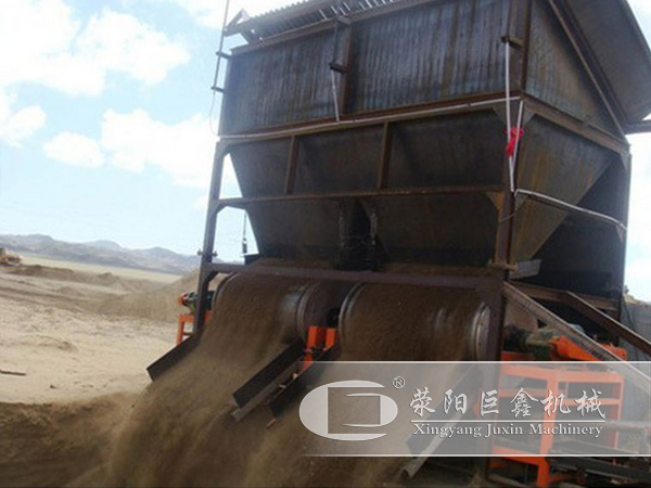河沙選鐵生產(chǎn)線配置有上料斗,用裝載機(jī)將要處理的沙子裝到上料斗里。河道里用的船上料有兩種形式,一種鏈斗式輸送機(jī),用于石子比較多的河道,還有一種是抽沙泵式,使用于石子比較少的河道,像漢江和黃河。